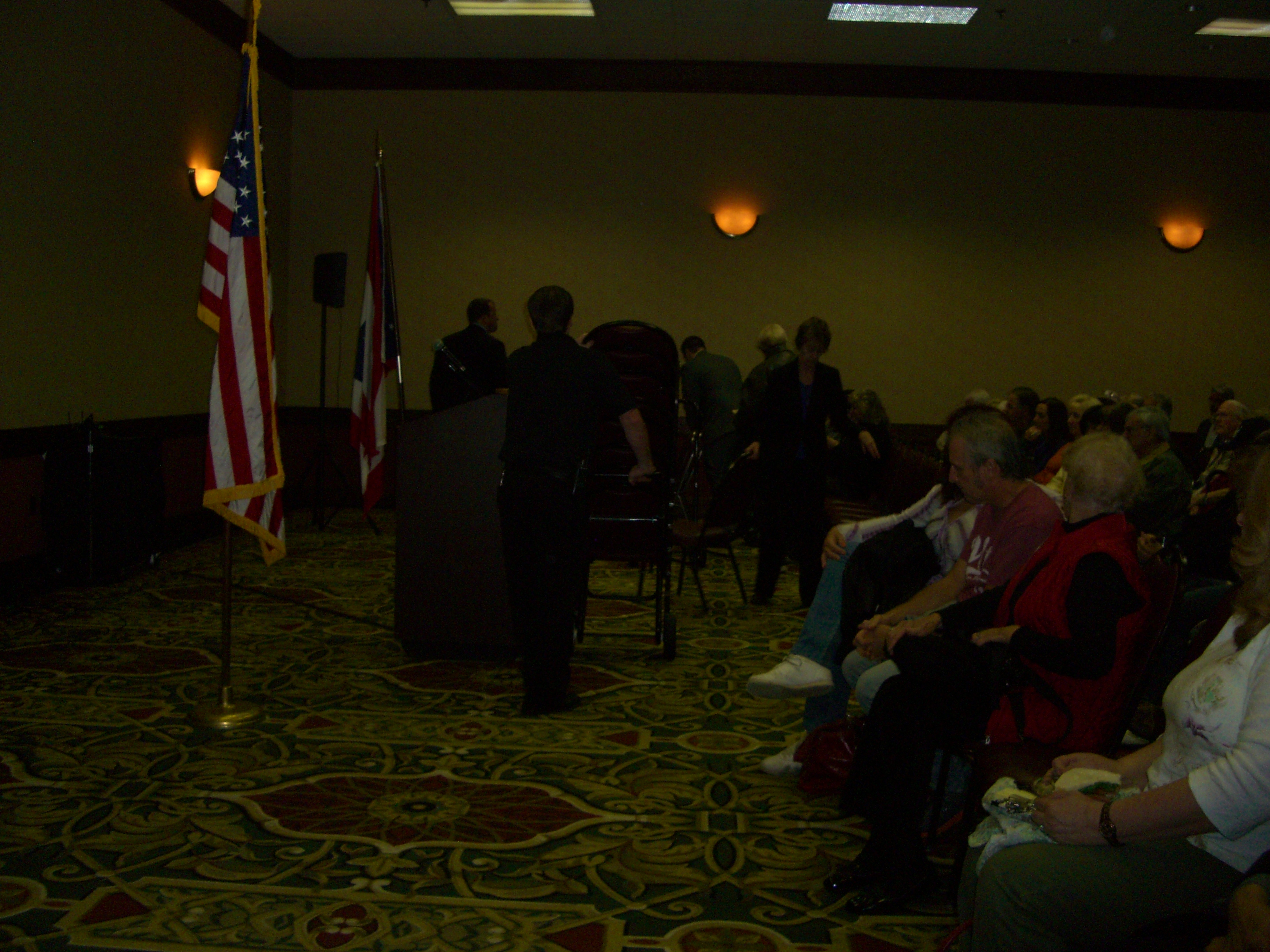 Adding to the picture, Holiday Inn staff continuously marched in wheeling racks of empty chairs to add to the front rows, eventually surrounding the empty podium during Dick Morris’ speech.